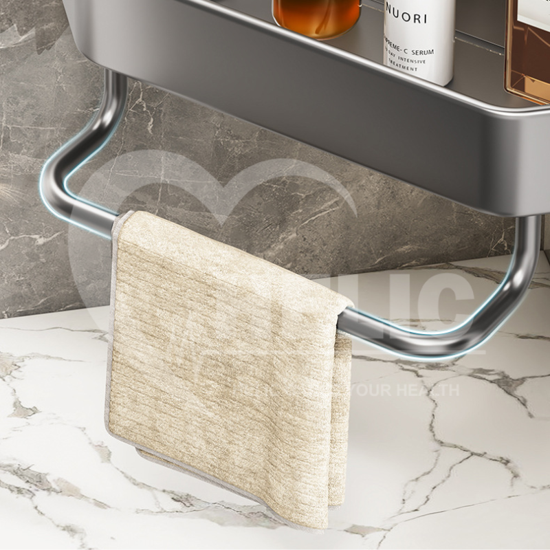 - Trang bị thanh treo khăn chắc chắn ngay bên dưới kệ, tăng thêm không gian lưu trữ mà không chiếm diện tích.