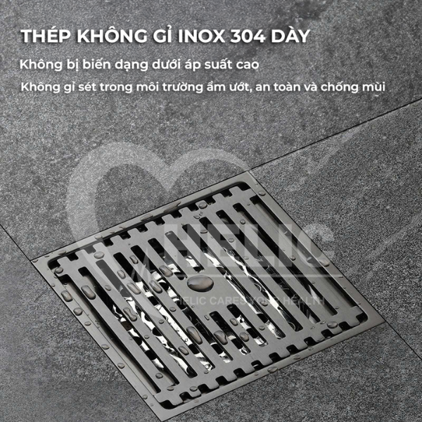 - Thoát sàn âm nhỏ gọn: Thiết kế tinh tế, tiết kiệm diện tích, dễ dàng vệ sinh, phù hợp nhiều phong cách nội thất.
