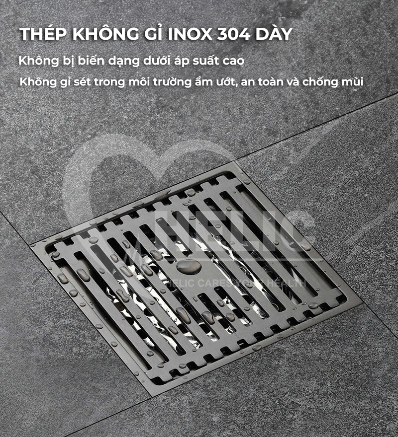 - Thoát sàn âm nhỏ gọn: Thiết kế tinh tế, tiết kiệm diện tích, dễ dàng vệ sinh, phù hợp nhiều phong cách nội thất.