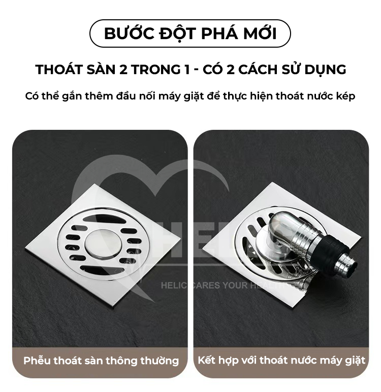 - Thiết kế 2 trong 1 thông minh: Vừa hoạt động như phễu thoát sàn thông thường, vừa có thể gắn thêm đầu nối để thoát nước máy giặt, đáp ứng nhiều nhu cầu cùng lúc.