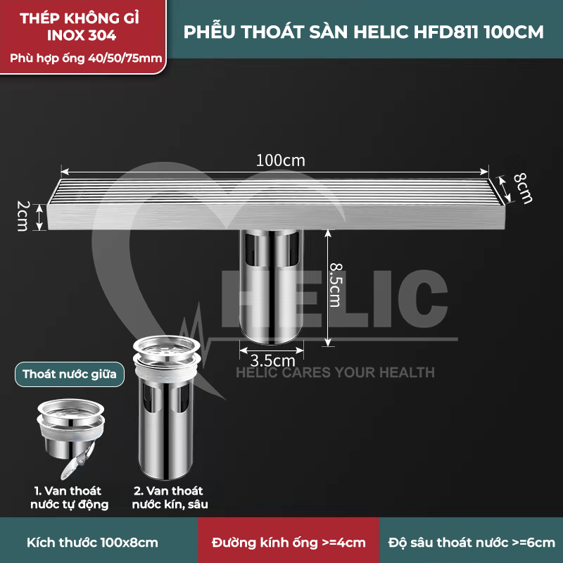 - Tên sản phẩm: Phễu thoát sàn Helic HFD811 100x8cm - Ống thoát giữa