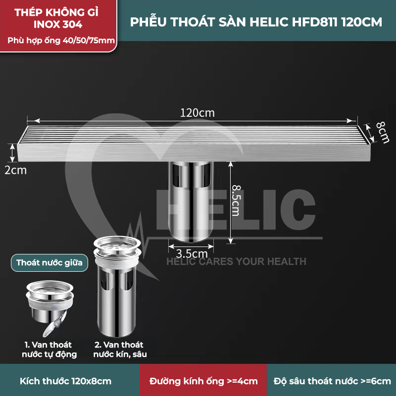 - Tên sản phẩm: Phễu thoát sàn Helic HFD811 120x8cm - Ống thoát giữa