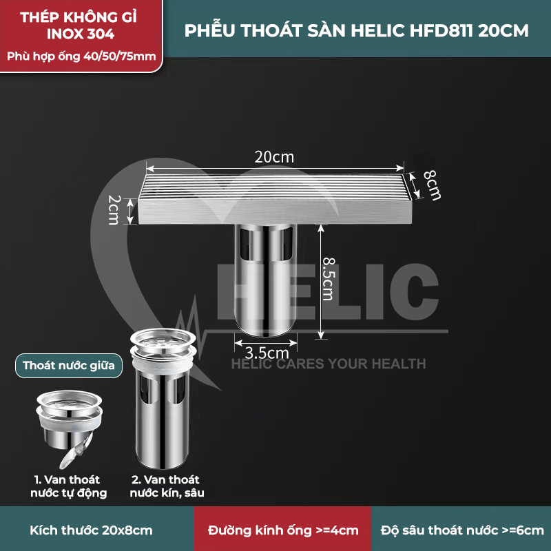 Trong cuộc sống hiện đại, vấn đề thoát nước trong phòng tắm, sân thượng hay khu vực sinh hoạt chung luôn là nỗi lo của nhiều gia đình. Tình trạng đọng nước gây trơn trượt, mùi hôi khó chịu từ cống rãnh hay côn trùng xâm nhập thường xuất phát từ việc lựa chọn phễu thoát sàn chưa phù hợp. Để khắc phục triệt để, Phễu thoát sàn Helic HFD811 20×8 cm - Ống thoát giữa ra đời như một giải pháp tối ưu. Sản phẩm được thiết kế bằng thép không gỉ inox 304, lõi gang chắc chắn, có khả năng thoát nước nhanh, chống mùi hiệu quả và đảm bảo an toàn trong quá trình sử dụng. Đây là lựa chọn lý tưởng cho mọi không gian hiện đại, vừa bền đẹp vừa tiện ích lâu dài.