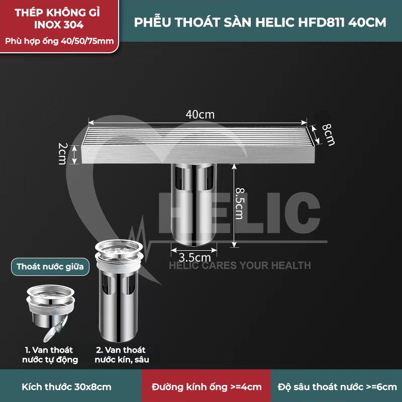 Trong cuộc sống hiện đại, vấn đề thoát nước trong phòng tắm, sân thượng hay khu vực sinh hoạt chung luôn là nỗi lo của nhiều gia đình. Tình trạng đọng nước gây trơn trượt, mùi hôi khó chịu từ cống rãnh hay côn trùng xâm nhập thường xuất phát từ việc lựa chọn phễu thoát sàn chưa phù hợp. Để khắc phục triệt để, Phễu thoát sàn Helic HFD811 40×8 cm - Ống thoát giữa ra đời như một giải pháp tối ưu. Sản phẩm được thiết kế bằng thép không gỉ inox 304, lõi gang chắc chắn, có khả năng thoát nước nhanh, chống mùi hiệu quả và đảm bảo an toàn trong quá trình sử dụng. Đây là lựa chọn lý tưởng cho mọi không gian hiện đại, vừa bền đẹp vừa tiện ích lâu dài.