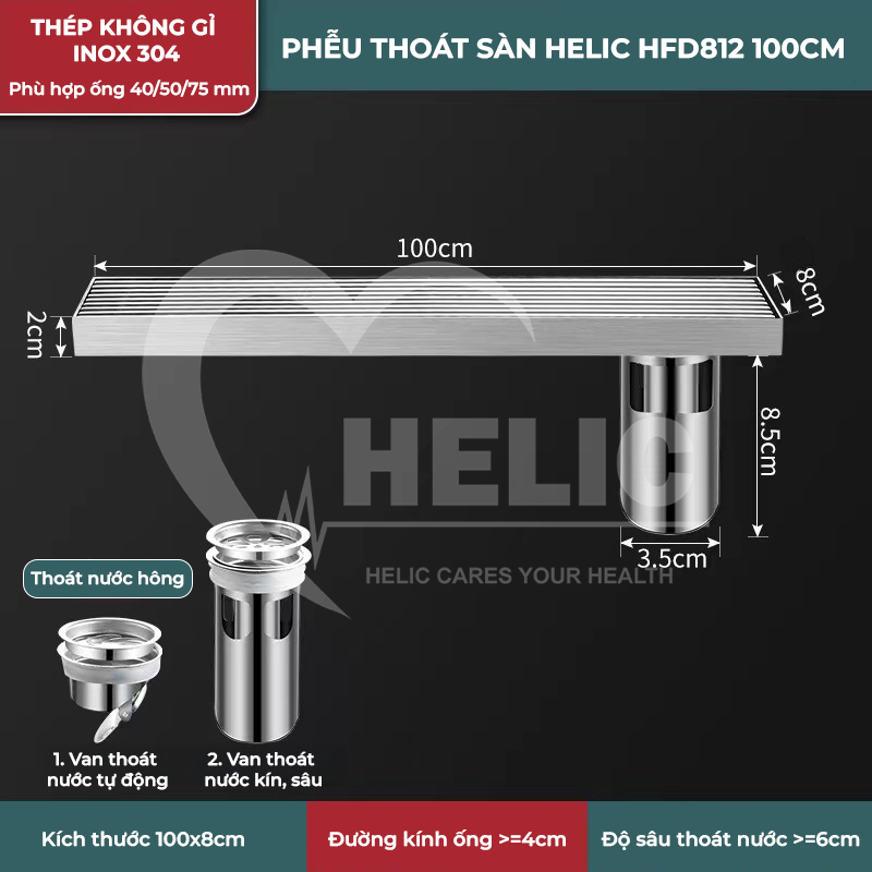 - Tên sản phẩm: Phễu thoát sàn Helic HFD812 100x8cm - Ống thoát hông