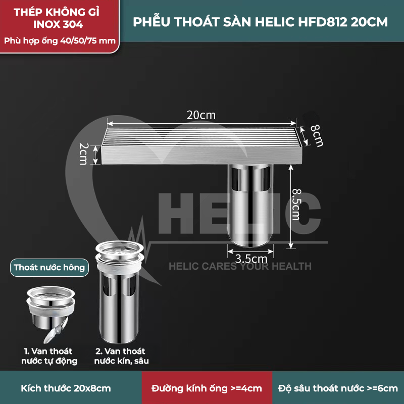 Trong cuộc sống hiện đại, vấn đề thoát nước trong phòng tắm, sân thượng hay khu vực sinh hoạt chung luôn là nỗi lo của nhiều gia đình. Tình trạng đọng nước gây trơn trượt, mùi hôi khó chịu từ cống rãnh hay côn trùng xâm nhập thường xuất phát từ việc lựa chọn phễu thoát sàn chưa phù hợp. Để khắc phục triệt để, Phễu thoát sàn Helic HFD812 20×8 cm - Ống thoát hông ra đời như một giải pháp tối ưu. Sản phẩm được thiết kế bằng thép không gỉ inox 304, lõi gang chắc chắn, có khả năng thoát nước nhanh, chống mùi hiệu quả và đảm bảo an toàn trong quá trình sử dụng. Đây là lựa chọn lý tưởng cho mọi không gian hiện đại, vừa bền đẹp vừa tiện ích lâu dài.