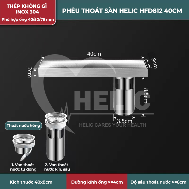 - Tên sản phẩm: Phễu thoát sàn Helic HFD812 40x8cm - Ống thoát hông