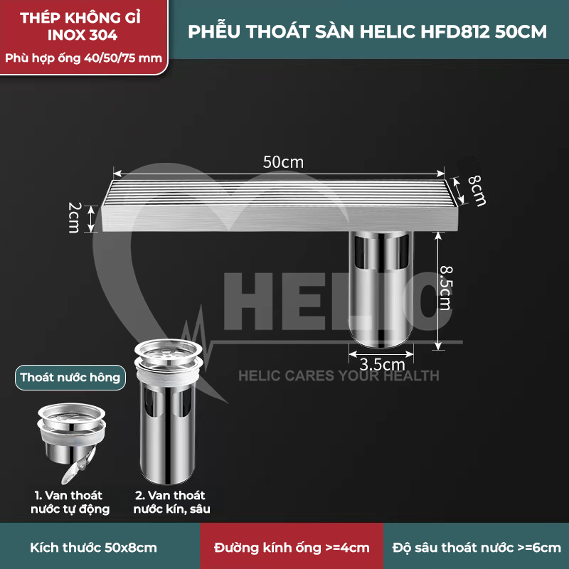 - Tên sản phẩm: Phễu thoát sàn Helic HFD812 50x8cm - Ống thoát hông