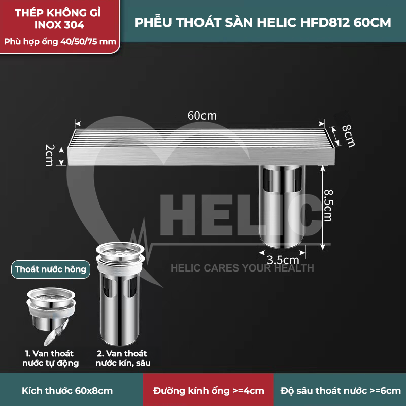 - Tên sản phẩm: Phễu thoát sàn Helic HFD812 60x8cm - Ống thoát hông