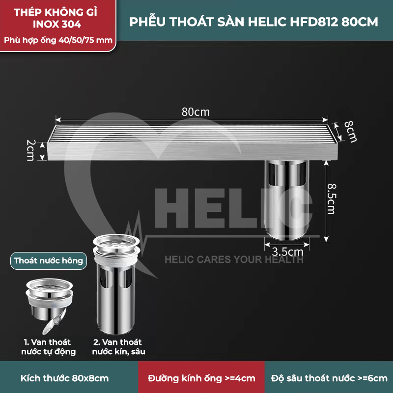 - Tên sản phẩm: Phễu thoát sàn Helic HFD812 80x8cm - Ống thoát hông