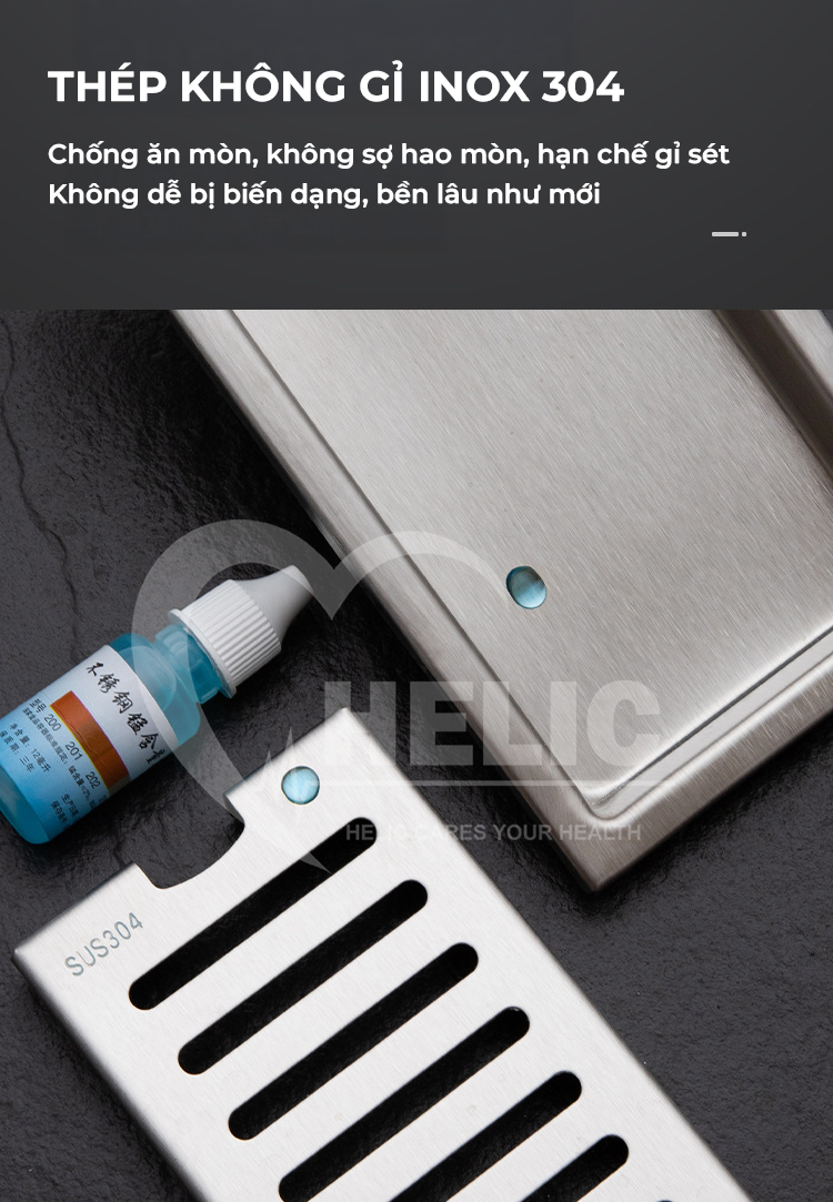 - Phễu thoát sàn Helic HFD813 được làm từ thép không gỉ inox 304 cao cấp, bền đẹp theo thời gian, không han gỉ, không oxy hóa.