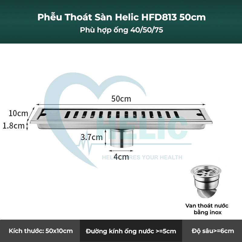 Trong hệ thống thoát nước của mỗi nhà, mỗi công trình, những vấn đề như tắc nghẽn đường ống, nước bẩn trào ngược, mùi hôi khó chịu và côn trùng từ cống thoát nước luôn gây ra nhiều khó chịu, ảnh hưởng đến sự tiện nghi và sức khoẻ. Do đó, phễu thoát sàn Helic HFD813 50x10cm ra đời như một giải pháp thông minh, giúp dễ dàng xử lý triệt để các rắc rối thường gặp trong hệ thống thoát nước. Với thiết kế hiện đại, tính năng vượt trội và độ bền cao, sản phẩm mang đến sự an tâm tuyệt đối cho mọi gia đình, công trình.