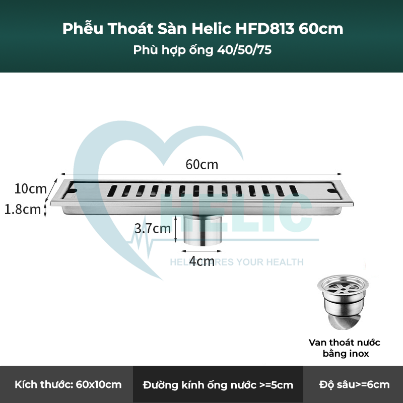 - Tên sản phẩm: Phễu thoát sàn Helic HFD813 60x10cm