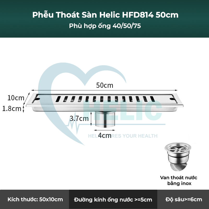 - Tên sản phẩm: Phễu thoát sàn Helic HFD814 50x10cm