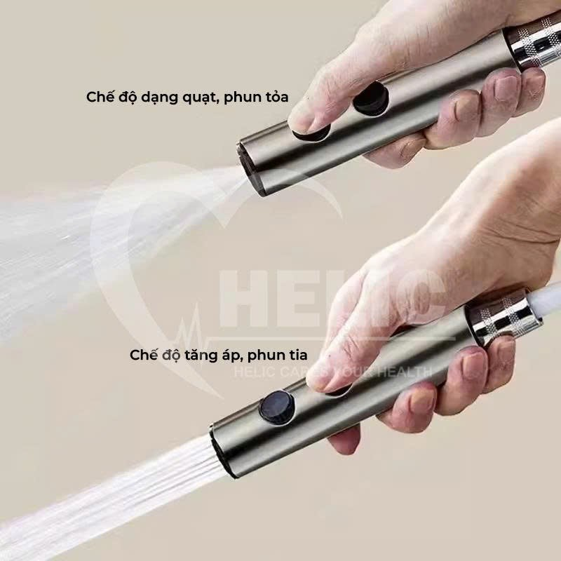 - Tay xịt cung cấp tính năng hai chế độ phun nước linh hoạt: chế độ dạng quạt, phun tỏa dùng cho vệ sinh dịu nhẹ/diện rộng và chế độ tăng áp, phun tia mạnh mẽ, tập trung để làm sạch chuyên sâu các vết bẩn cứng đầu.